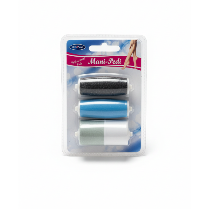 Now boxed as shown (with a free set of replacement heads included), the MedeScan Mani-Pedi makes at-home pampering effortless and affordable.